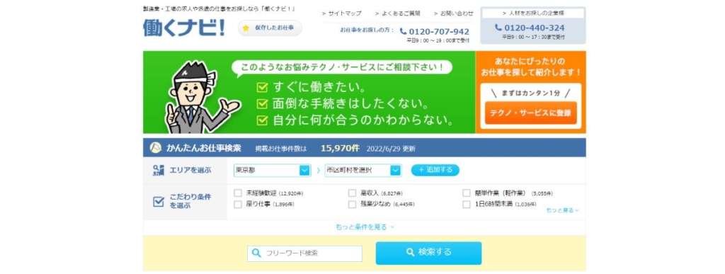 「テクノ・サービス 働くナビ!」は、製造業・工場の求人が豊富です。工場での食品加工や検査・梱包、物流・運搬などの求人をお探しの人にぴったり。