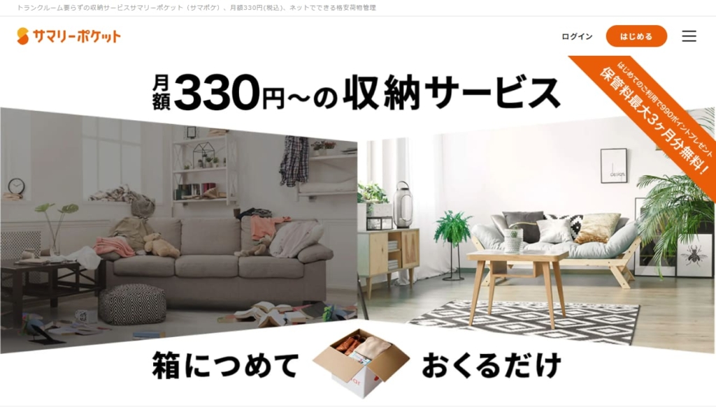 「サマリーポケット」は預けたいものを箱につめて送るだけで利用できる収納サービスです。初期費用が不要で、1箱330円(税込)からリーズナブルな価格で預けられます。